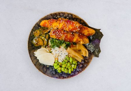 Curry tare, kurczak w panko, olej cytrusowy, kolendrą , dymka, cebula, jajko, narutomaki