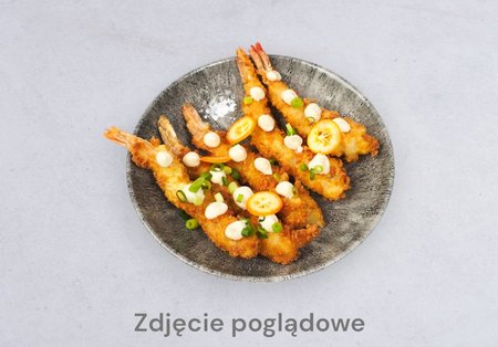 Curry tare, smażone krewetki, olej cytrusowy, kolendrą , dymka, cebula, jajko, narutomaki